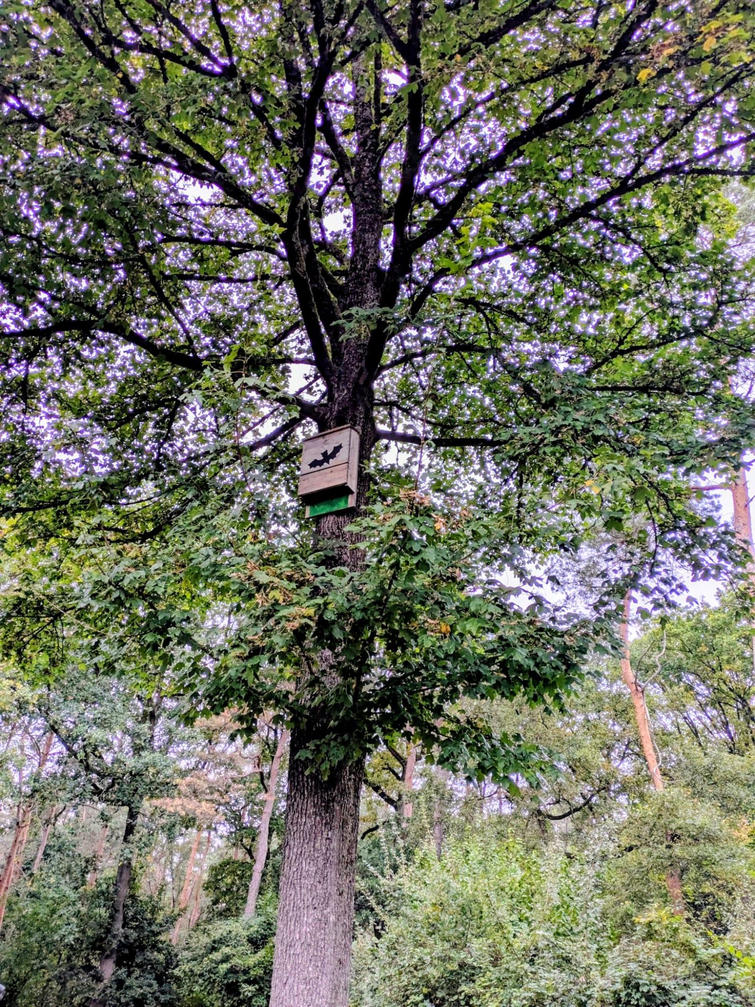 Am Waldrand des Wohngebiets Sternbusch wurde in etwa fünf Metern Höhe ein Fledermauskasten mit südöstlicher Ausrichtung angebracht.