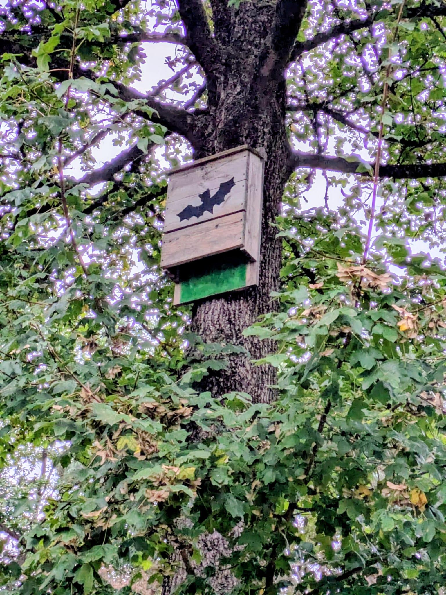 Im Wohngebiet Sternbusch wurde ein Wochenstubenkasten für eine ganze Fledermauskolonie in etwa sechs Metern Höhe mit östlicher Ausrichtung angebracht.